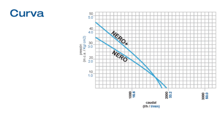 Caudal máximo entregado: 33 L/min (1980 L/h – 1,9 m3/h).