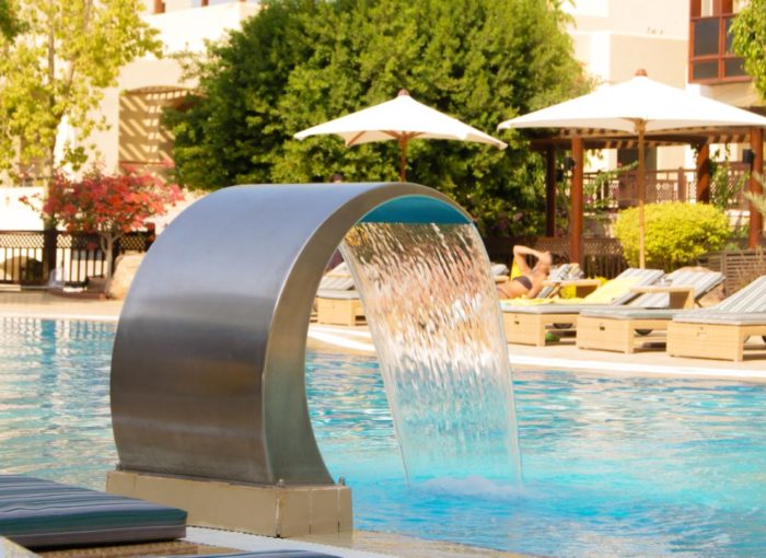 Cascada volumétrica de acero inoxidable para vereda con altura de 46,5 cm. Genera una lámina de agua vistosa y continua de 35 cm. de ancho hasta el espejo de agua. Su terminación en pulido brillante destaca y ofrece un distintivo ornamental para su piscina.