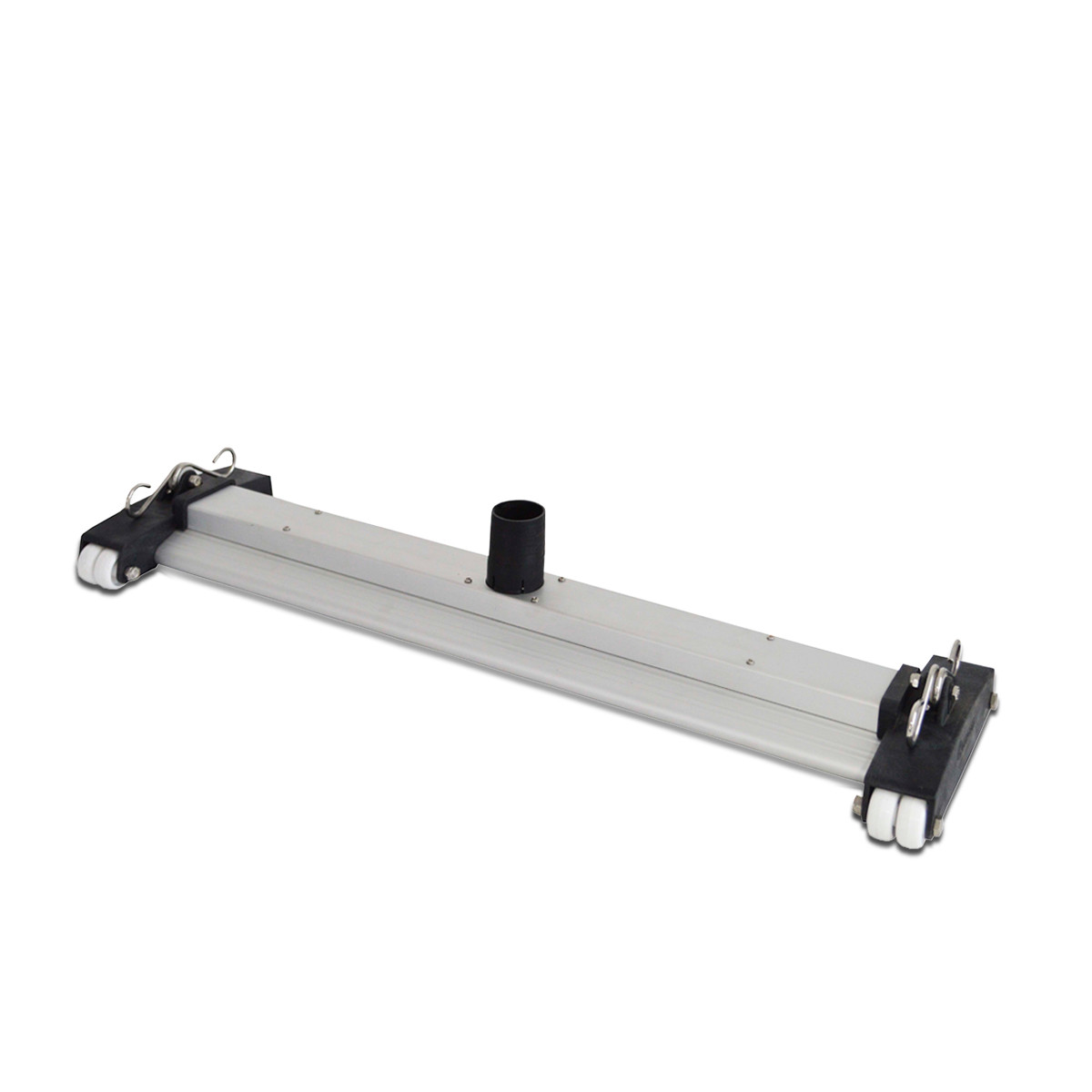 Limpiafondo de aluminio con 4 ruedas dobles fijas, y cepillos de polipropileno intercambiables. Ancho de 82 cm y boca de aspiración de 2″. Ideado para piscinas de gran tamaño o profesionales, reemplazando el mango por un sistema de cuerdas y poleas para utilizar entre 2 personas.